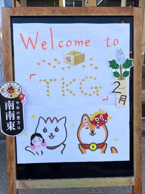 マドレーヌとウェルカムボードも節分仕様に☆社内も節分モード一色です。