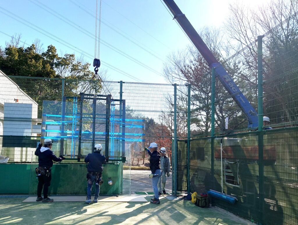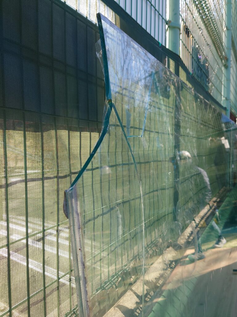今回は、公園内にあるテニスコート施設の、ヒビが入った窓ガラスの交換工事を行いました。