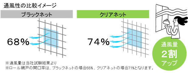 糸のスリム化により、通風量は従来品に比べて20%アップ!カラっと晴れた日に窓を開けるのが気持ち良くなります◎